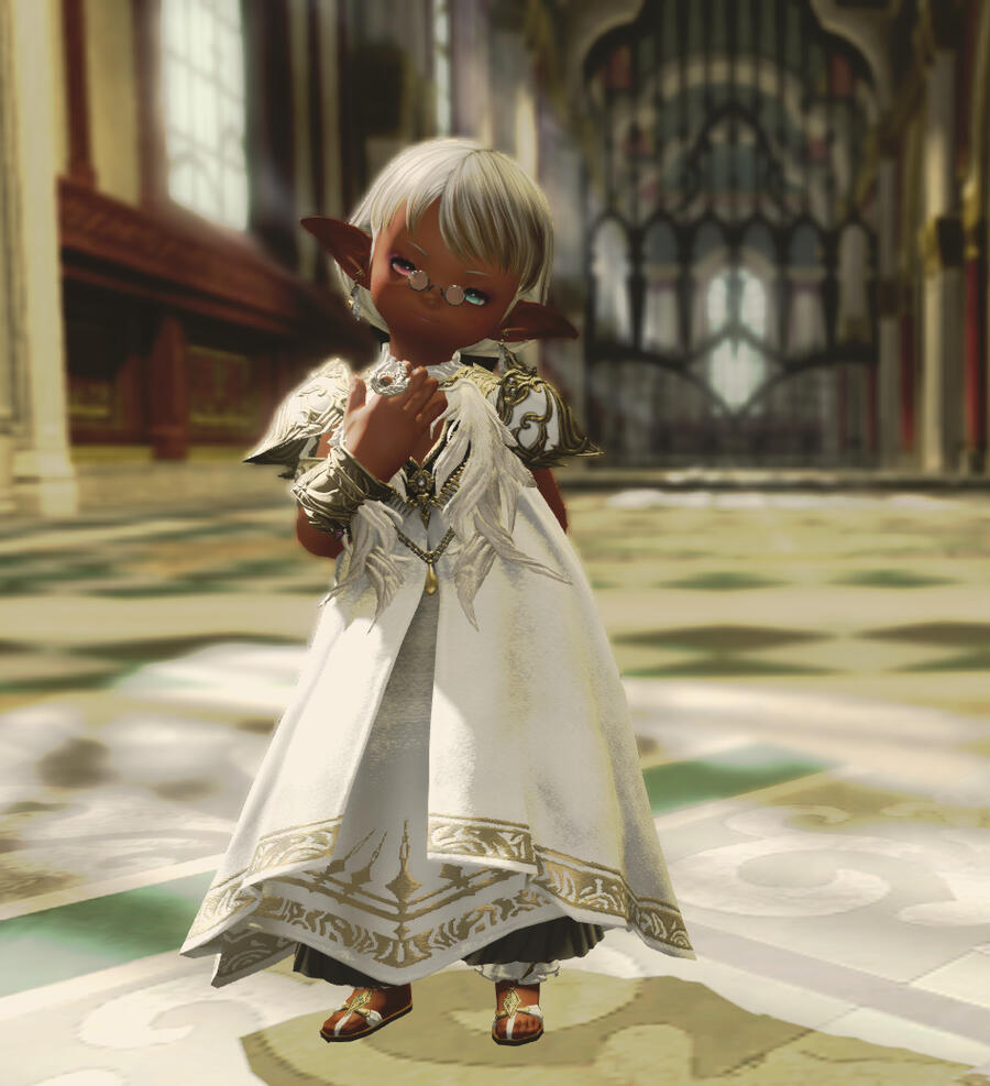 Hair: SilverChances are good that if you find yourself speaking to Rorasho Rasho, you’re either on the verge of bankruptcy or looking for an opportunity to make lucrative coin. Harsh, but fair — if you can survive her terms.Rorasho Rasho left her tenured position as a professor of astromancy at the Sharlayan Studium and her place in the Forum to pursue a higher goal: making obscene amounts of money. She believes she can use her ill-gotten gains to affect some real change in those who need it most. By throwing in her lot with the Monetarists, she seeks to give the seat of the Ul’dahn government where it rightfully belongs.Rorasho has never lost her scholarly air, something that others might find overbearing, but decades of teaching have given her patience and a willingness to ensure her associates understand what’s happening as long as it’s to her convenience. Otherwise stoic, the Lalafell seems to be at her liveliest when discussing new ideas and innovations, and relishes in power plays as spectacles worth watching.